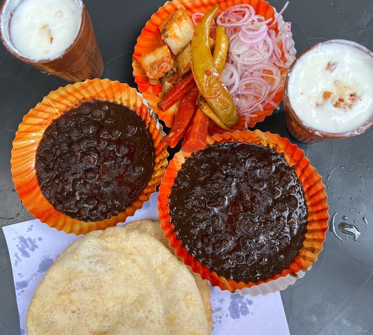 Famous black chole [chickpeas not chana] prepared in traditional and old delhi's secret recipe served with soft bhature. You can always instruct if you like your bhature to be fried till it is red in colour and we'll cater to your request